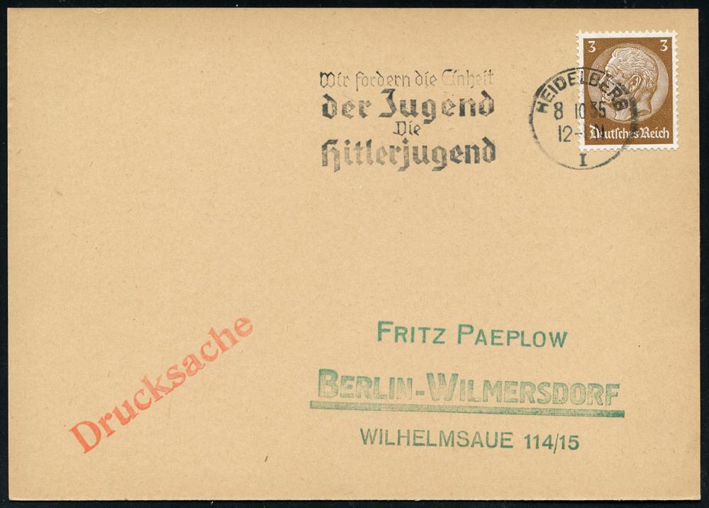 2940 | 16 € | 6900 Heidelberg Maschinen- & Serienstempel : HEIDELBERG/ I/ Wir fordern die Einheit/ der Jugend/ Die/ Hitlerjugend 1935 (8.10.) seltener MWSt klar auf Inl.-Karte (Bo.S 182 A,nur 24 Tage in nur 8 Orten Süddeutschlands) | ![]() | |