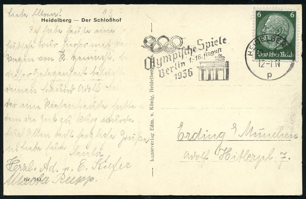 2941 | 18 € | 6900 Heidelberg Maschinen- & Serienstempel : HEIDELBERG 1/ p/ Olymp.Spiele/ Berlin 1.-16.Aug. 1936 (27.7.) relativ seltener MWSt (Brandenbg.Tor etc.) klar gest. s/w.-Foto-Ak.: Der Schloßhof, Bedarf (Bo.S 207 A, nur wenige Monate 1936 verwendet) | ![]() ![]() | |