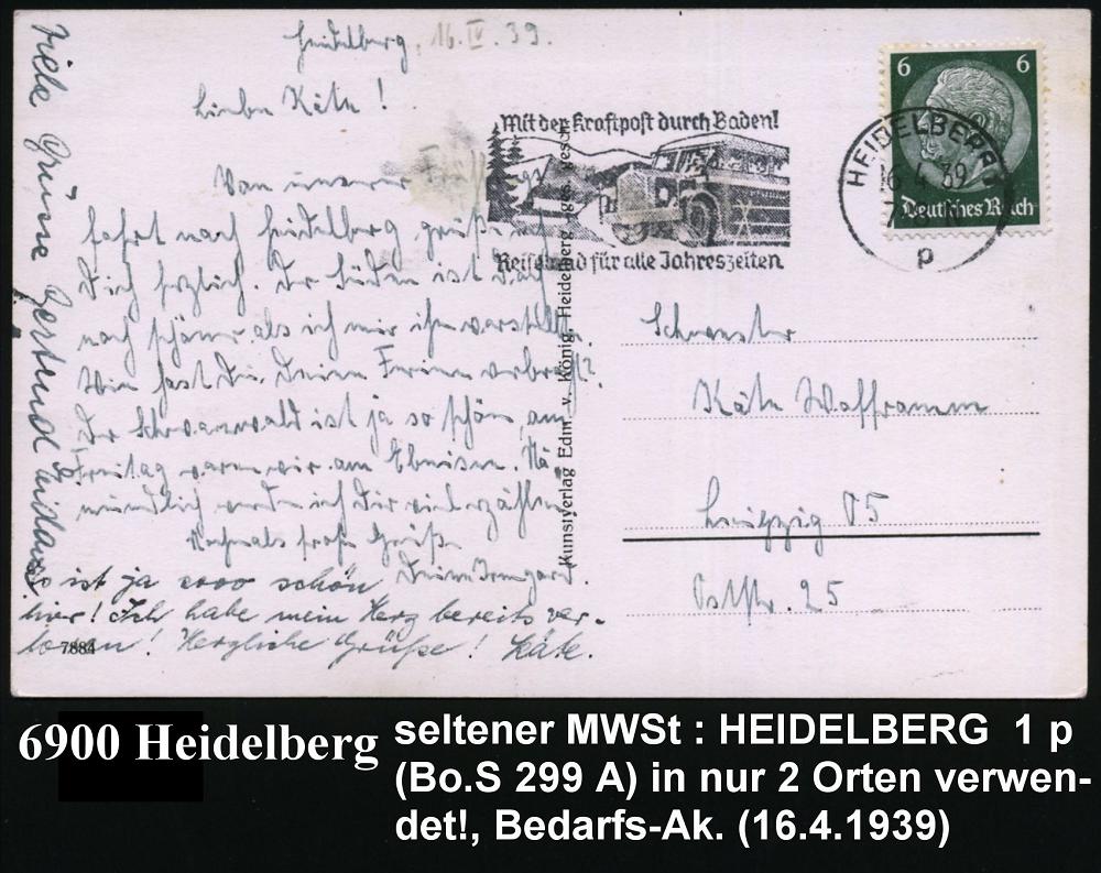 2945 | 14 € | 6900 Heidelberg Maschinen- & Serienstempel : HEIDELBERG 1/ p/ Mit d.Kraftpost durch Baden!/ Reiseland.. 1939 (16.4.) MWSt = Omnibus (vor. Bauernhaus) auf s/w.-Foto-Ak.: Philosophenweg im Frühling, Bedarf (Bo.S 299 A , nur in 2 Orten verwendet!) | ![]() ![]() | |