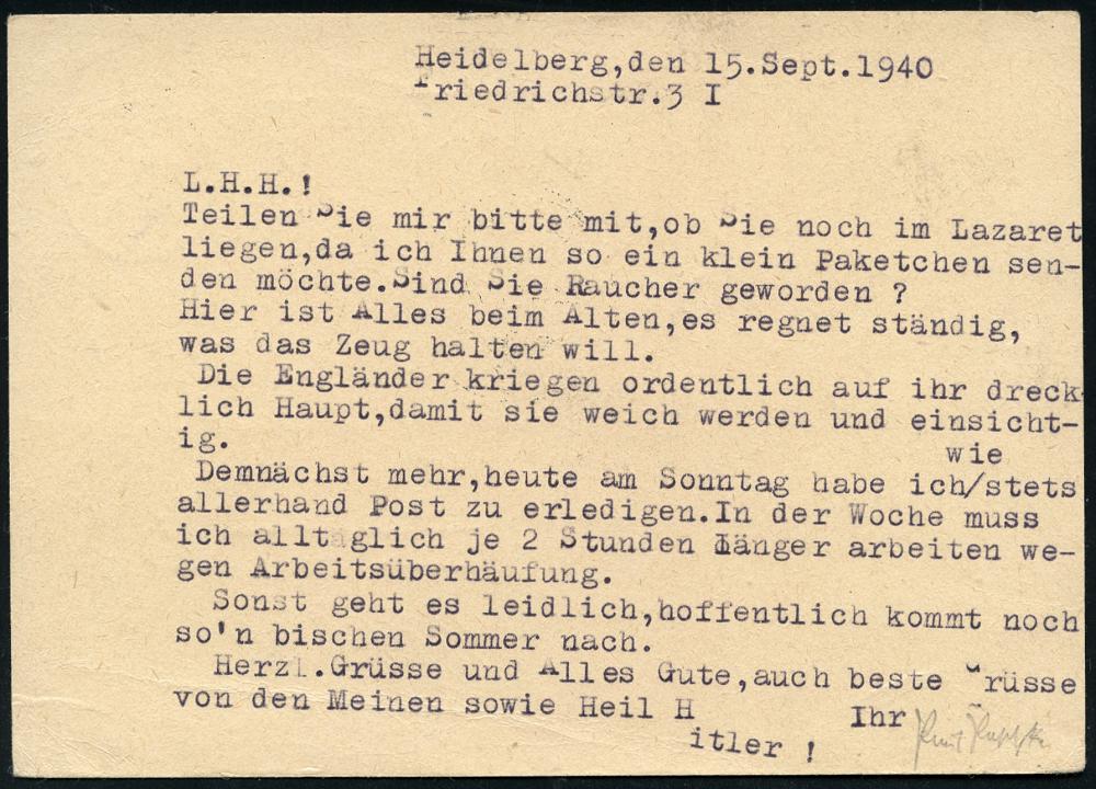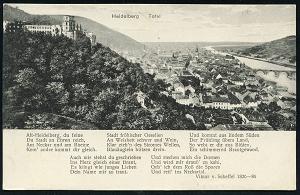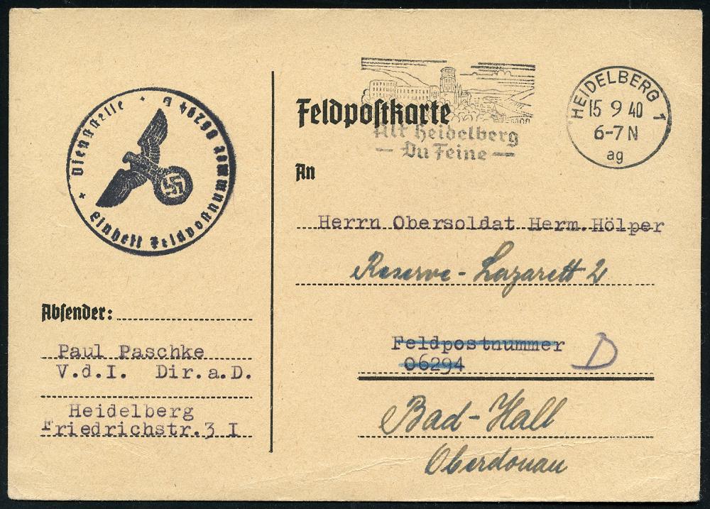 2946 | 14 € | 6900 Heidelberg Maschinen- & Serienstempel : HEIDELBERG 1/ ag/ Alt Heidelberg/ Du Feine 1940 (15.9.) MWSt = Anfang eines Liedtextes von Schumann (Schloß)l, klar gest., nachgesandte. Feldpost-Kt. (Bo.16 A III) | ![]() ![]() | |