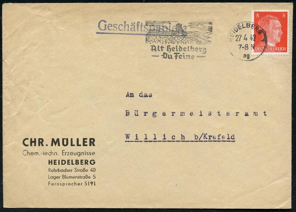 2949 | 14 € | 6900 Heidelberg Maschinen- & Serienstempel : HEIDELBERG 1/ ag/ Alt Heidelberg/ Du Feine 1942 (27.4.) MWSt = Liedtext von Schumann (Schloß) klar auf Firmen-Bf.: CHR. MÜLLER, Chem.-techn. Erzeugnisse.. (Bo.16 A) | ![]() | |