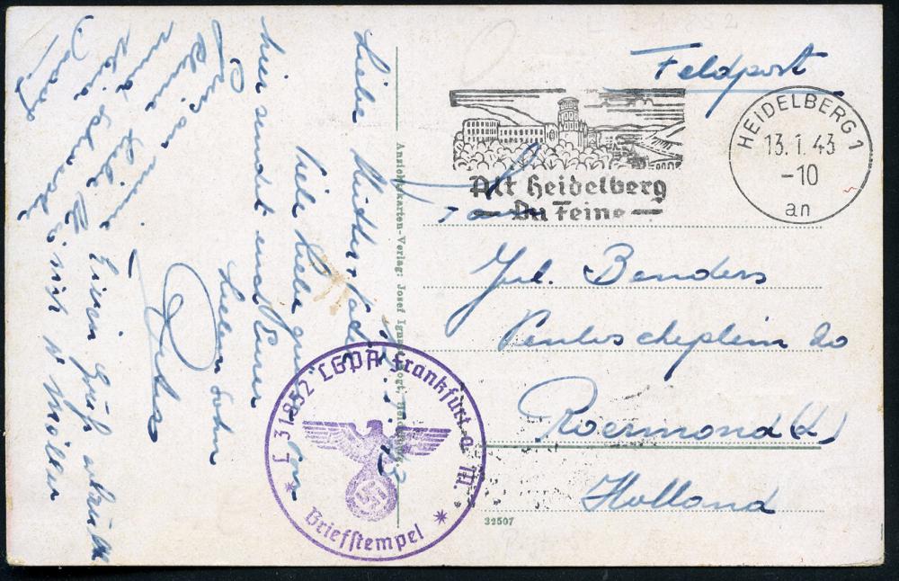 2950 | 35 € | 6900 Heidelberg Maschinen- & Serienstempel : HEIDELBERG 1/ an/ Alt Heidelberg/ Du Feine 1943 (13.1.) MWSt = Liedtext von Schumann (Schloß) + viol. 1K-HdN: L 31852 LGPA Frankfurt a. M. = Reg.-Stab Flak Rgt. 49 , klar gest. Ausl.-Feldpost-Ak.: Schloß (u. Ort) eines Niederländers in der Wehrmacht n. Roermond, Holland!, seltener Beleg! (Bo.16 A IV) | ![]() ![]() | |