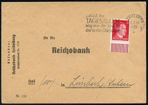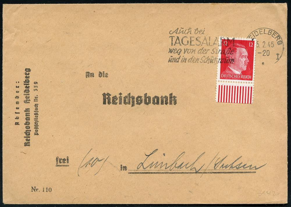 2956 | 23 € | 6900 Heidelberg Maschinen- & Serienstempel : HEIDELBERG/ **I/ Auch bei/ TAGESALARM/ weg von der Straße/ u.in den Schutzraum 1945 (5.2.) seltener MWSt auf spätem Reichsbank-Bf. (Bo.S 421 A) | ![]() | |