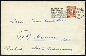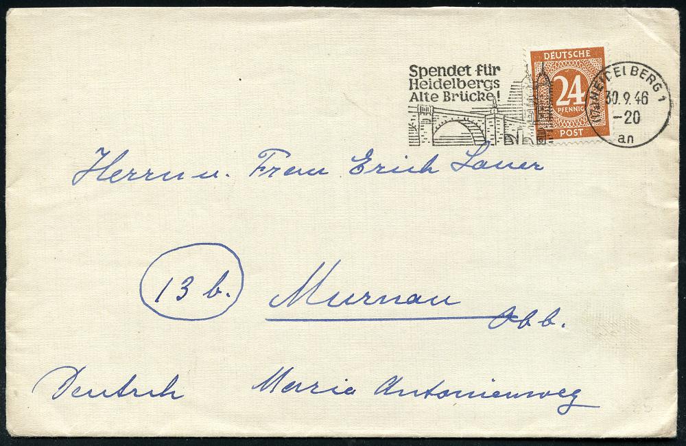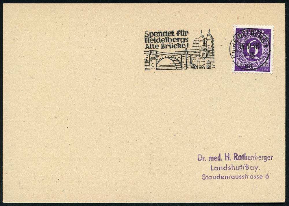 2958 | 15 € | 6900 Heidelberg Maschinen- & Serienstempel : (17a) HEIDELBERG 1/ an/ Spendet für/ Heidelbergs/ Alte Brücke 1946 (30.9.) MWSt = "Alte Brücke" (Neckar-Brücke) klar gest. Inl.-Bf., EF 24 Pf. Konrollrat (Bo.25 A, nur ca. 1/2 Jahr verwendet) | ![]() | |
