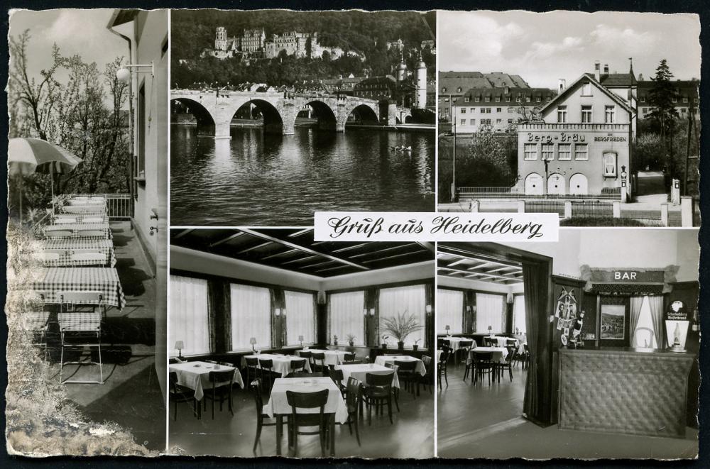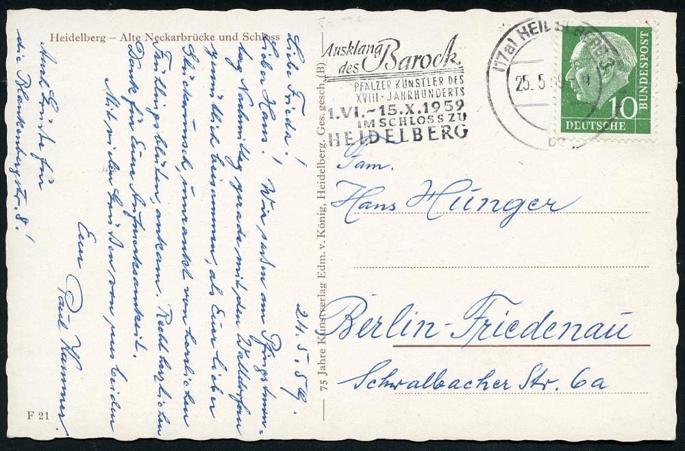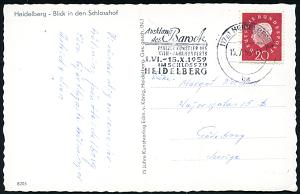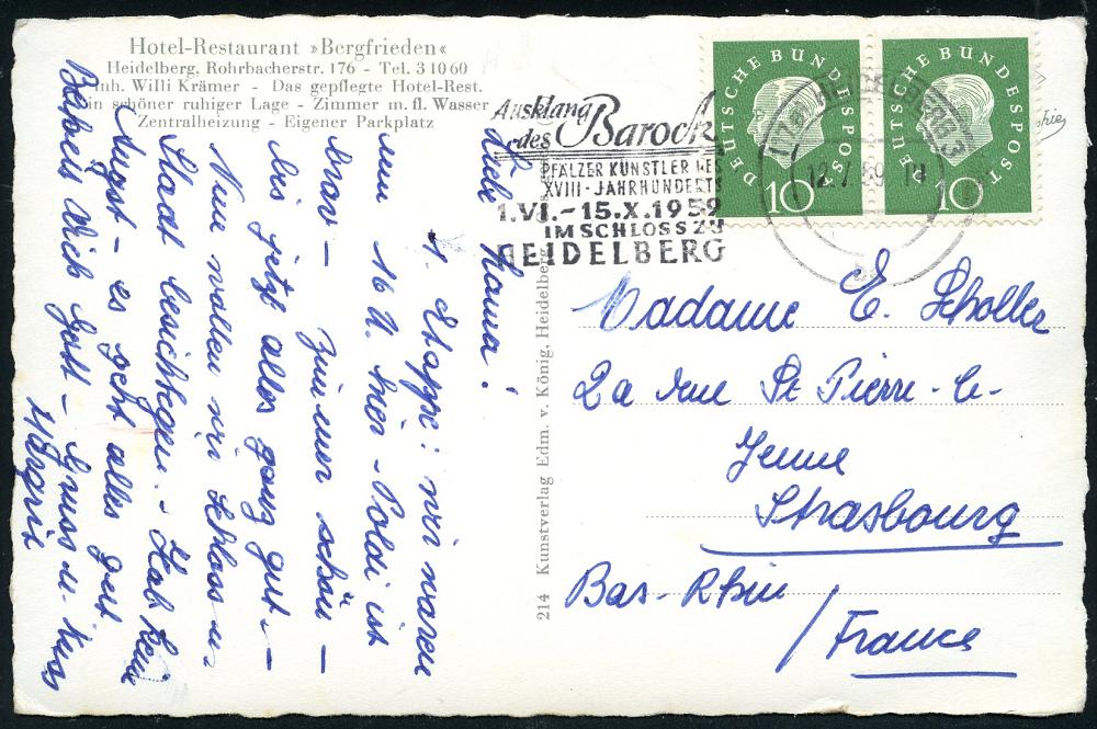 2964 | 15 € | 6900 Heidelberg Maschinen- & Serienstempel : (17a) HEIDELBERG 1/ ba/ Ausklang/ des Barock/ PFÄLZER KÜNSTLER DES/ XVIII.JHDTS 1958 (12.7.) MWSt klar auf s/w.-Foto-Ak.: Gruß aus Heidelberg mit 5 Ansichten Hotel Restaurant "Bergfrieden", Ausl.-Bedarf (Bo.39 A) | ![]() ![]() | |