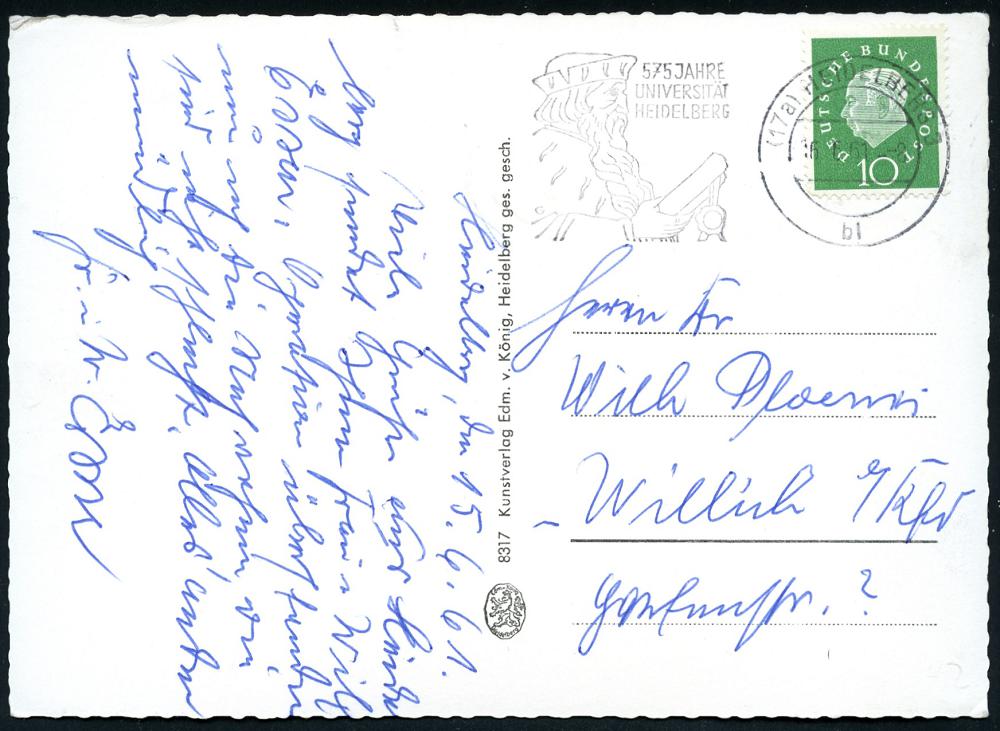 2966 | 14 € | 6900 Heidelberg Maschinen- & Serienstempel : (17a) HEIDELBERG 3/ bl/ 575 JAHRE/ UNIVERSITÄT 1961 (16.6.) MWSt = Kurfürst Ruprecht (mit Gründungs-Urkunde) auf s/w.-Foto-Ak.: Heidelberg, Blick vom Philosophenweg (Bo.42 A II) | ![]() ![]() | |