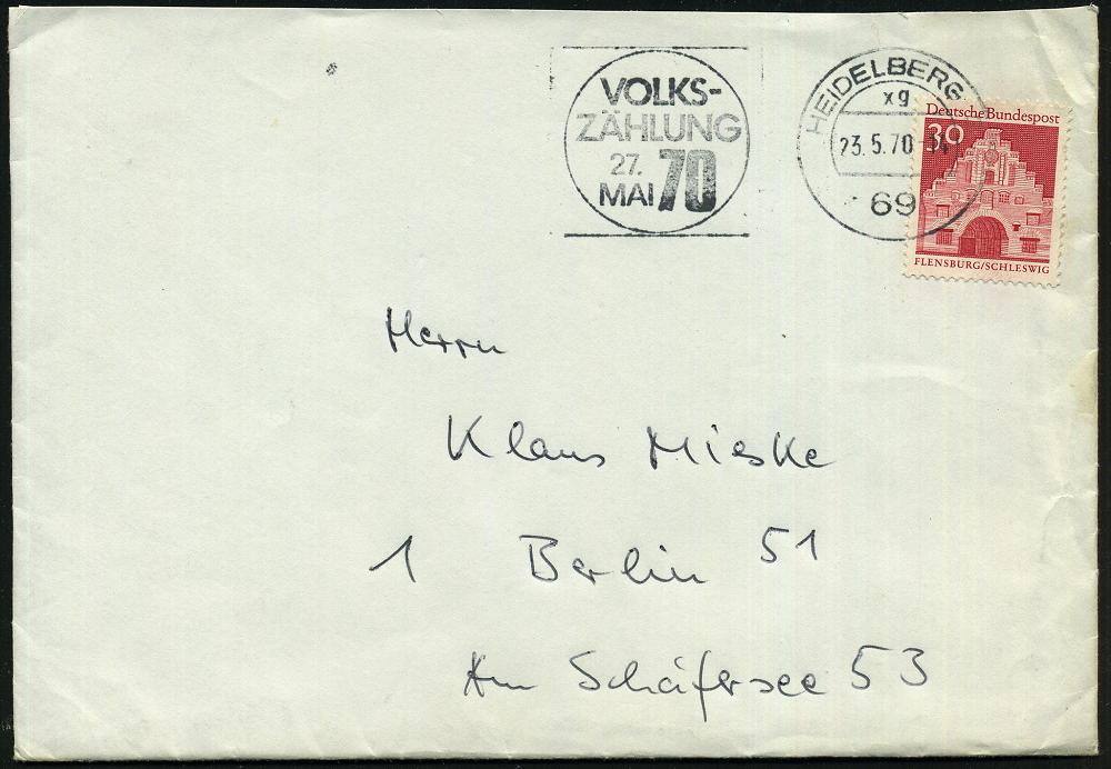 2968 | 12 € | 6900 Heidelberg Maschinen- & Serienstempel : 69 HEIDELBERG 3/ xg/ VOLKS-/ ZÄHLUNG/ 27.MAI/ 70 1970 (23.5.) MWSt klar auf Bedarfs-Bf. (Bo.S 1223 A , nur in 7 Orten verwendet!) | ![]() | |