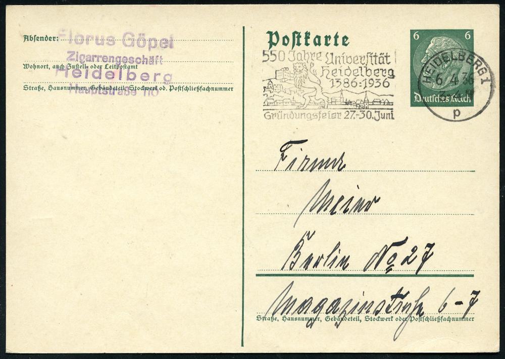 2942 | 14 € | 6900 Heidelberg Maschinen- & Serienstempel : HEIDELBERG 1/ p/ 550 Jahre Universität.. 1936 (6.4.) MWSt (= Löwe mit Buch vor Ortsbild) Bedarfs-Kt.! (Bo.12 A) | ![]() | |