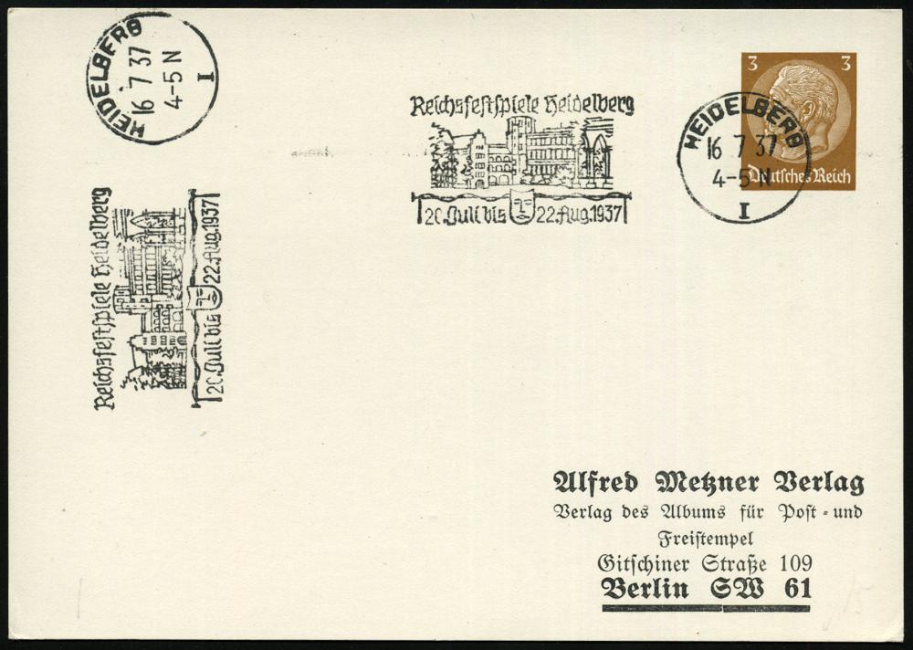 2943 | 18 € | 6900 Heidelberg Maschinen- & Serienstempel : HEIDELBERG/ I/ Reichsfestspiele../ 20.Juli bis 22.Aug. 1937 (16.7.) MWSt = Schloß/Theatermaske 2x auf PP 3 Pf. Hindenbg.: Alfred Metzner Verlag.. (Mi.PP 122/B 9) klar gest.! (Bo.15 A) | ![]() | |
