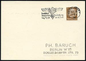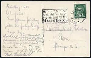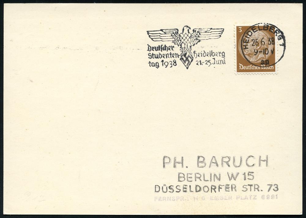 2944 | 12 € | 6900 Heidelberg Maschinen- & Serienstempel : HEIDELBERG 1/ ag/ Deutscher/ Studenten-/ tag 1938 (Juni) MWSt (NS-Adler-Emblem) klar gest. Inl.-Karte (Bo.17 A) | ![]() | |