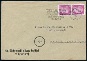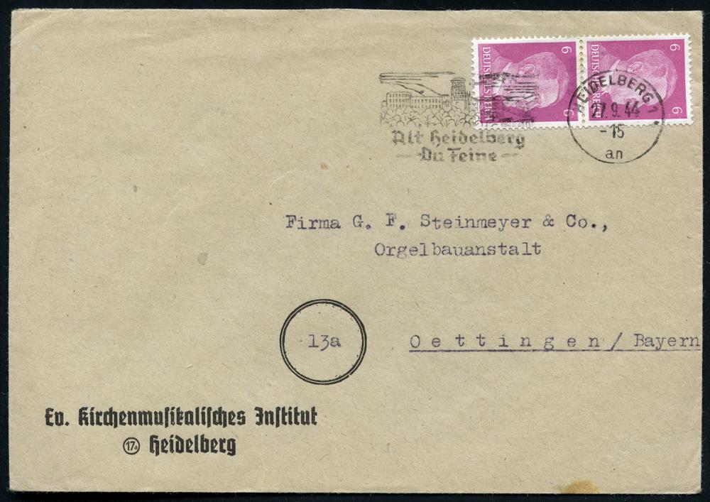 2954 | 18 € | 6900 Heidelberg Maschinen- & Serienstempel : HEIDELBERG 1/ an/ Alt Heidelberg/ Du Feine 1944 (27.9.) MWSt = Liedtext von Schumann (Schloß) auf Vordruck-Bf.: Ev. kirchenmusikalisches Jnstitut.. , Fern-Bf. (Bo.16 A IV) | ![]() | |