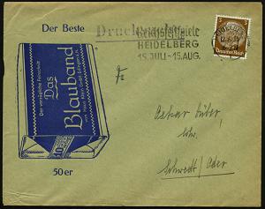 2937 | 18 € | 6900 Heidelberg Maschinen- & Serienstempel : HEIDELBERG/ I/ Reichsfestspiele.. 1934 (12.6.) MWSt auf Reklame-Bf.: Das Blauband.. Haus Klein GmbH Edingen a. Neckar = Tabak-Feinschnitt-Packung, Fernbf. (Bo.10 A) | ![]() | |