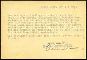 2948 | 18 € | 6900 Heidelberg Maschinen- & Serienstempel : HEIDELBERG 17ag/ Alt Heidelberg/ Du feine 1942 (5.3.) MWSt auf Zeitungssache (blauer 1L) + blauer 1L: Postamt=Zeitungsstelle, (rs.) interess. Text: Kriegswirtschaft!, Fernkt. | ![]() ![]() | |