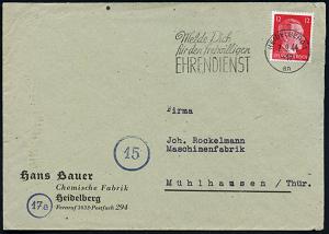 2953 | 18 € | 6900 Heidelberg Maschinen- & Serienstempel : HEIDELBERG 1/ ag/ Melde Dich/ für den freiwilligen/ EHRENDIENST 1944 (7.9.) seltener MWSt klar auf Firmen-Bf.: Hans Braun, Chemische Fabrik.. (Dü.S 422 A, nur 8 Monate verwendet) | ![]() | |