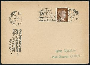 2955 | 18 € | 6900 Heidelberg Maschinen- & Serienstempel : HEIDELBERG/ **I/ Auch bei/ TAGESALARM/ weg von der Straße/ u.in den Schutzraum 1945 (24.1.) seltener MWSt 2x auf Drs.-Karte (Bo.S 421 A) | ![]() | |