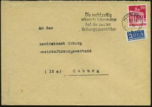 2959 | 12 € | 6900 Heidelberg Maschinen- & Serienstempel : (17a) HEIDELBERG 1/ an/ Die rechtzeitig/ erkannte Tuberkulose/ hat d.besten/ Heilungsaussichten 1949 (11.6.) MWSt klar auf 20 Pf. Bauten + 2 Pf. NoB, Fern-Bf. (Bo.S 444 A , nur in 5 Orten verwendet!) | ![]() | |
