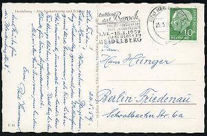 2963 | 12 € | 6900 Heidelberg Maschinen- & Serienstempel : (17a) HEIDELBERG 1/ ba/ Ausklang/ des Barock/ PFÄLZER KÜNSTLER DES/ XVIII.JHDTS 1958 (15.7.) MWSt klar auf s/w.-Foto-Ak.: Blick in den Schloßhof, Ausl.-Bedarf (Bo.39 A) | ![]() ![]() | |