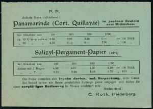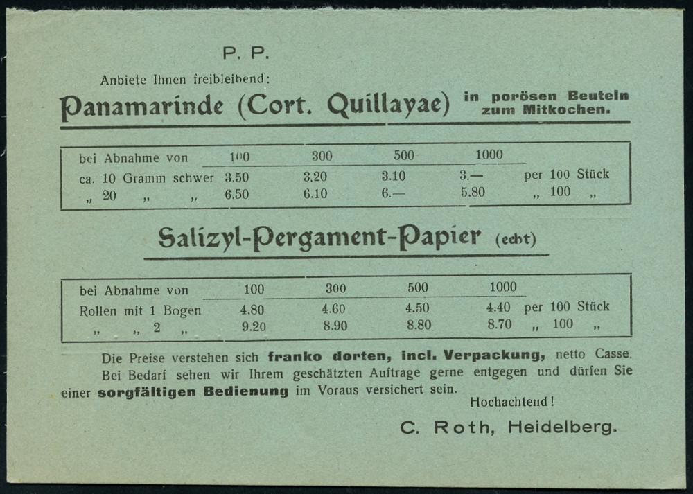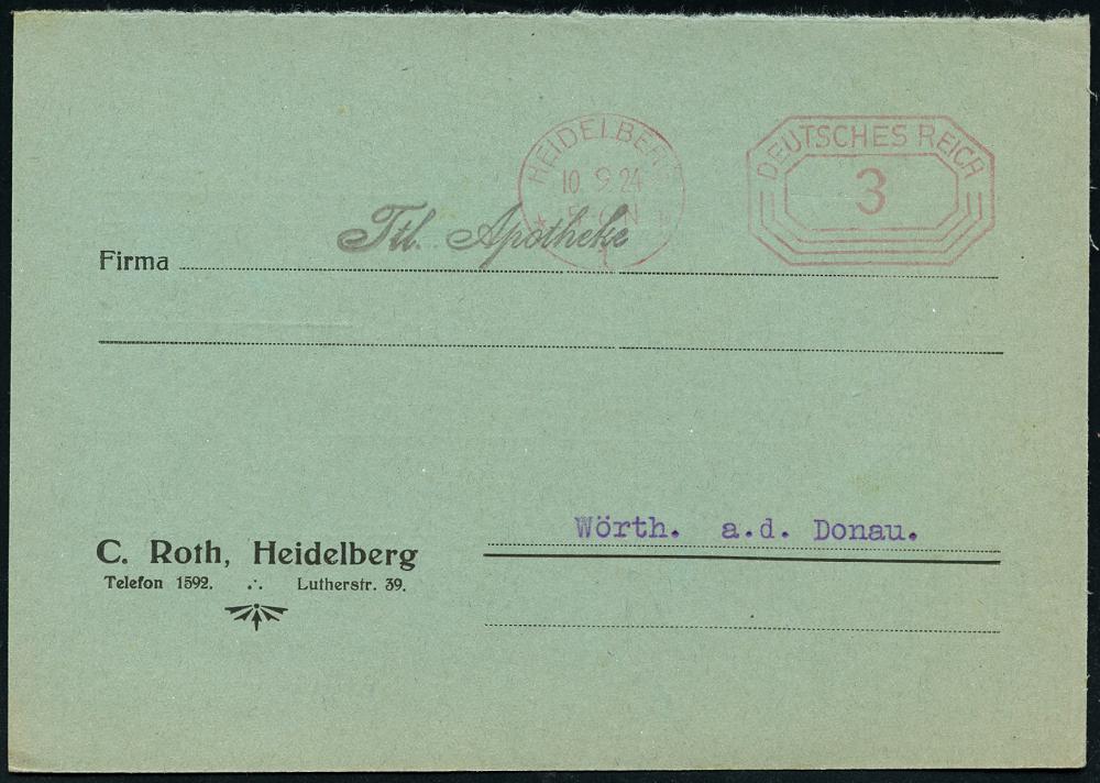2971 | 15 € | 6900 Heidelberg Post-Freistempel : HEIDELBERG/ *1I/ DEUTSCHES REICH 1924 (10.9.) PFS 3 Pf. "Achteck" auf (halber) Reklame-Kt.: C. Roth.. für Panamarinde u. Salizyl-Pergament-Papier.. (Dü.D-4) | ![]() ![]() ![]() | |