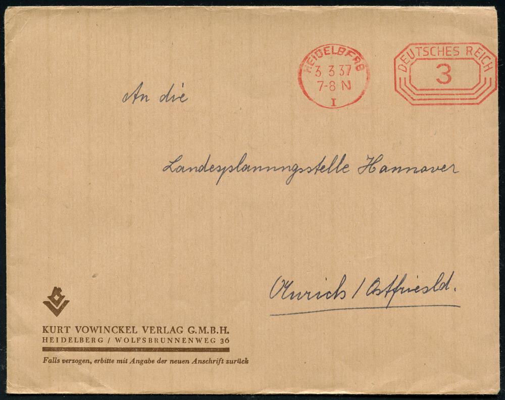2974 | 10 € | 6900 Heidelberg Post-Freistempel : HEIDELBERG/ I/ DEUTSCHES REICH 1937 (3.3.) PFS 3 Pf. "Achteck" auf Firmen-Bf.: KURT VOWINKEL VERLAG GMBH.. (Dü.D-4) | ![]() ![]() | |