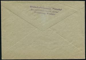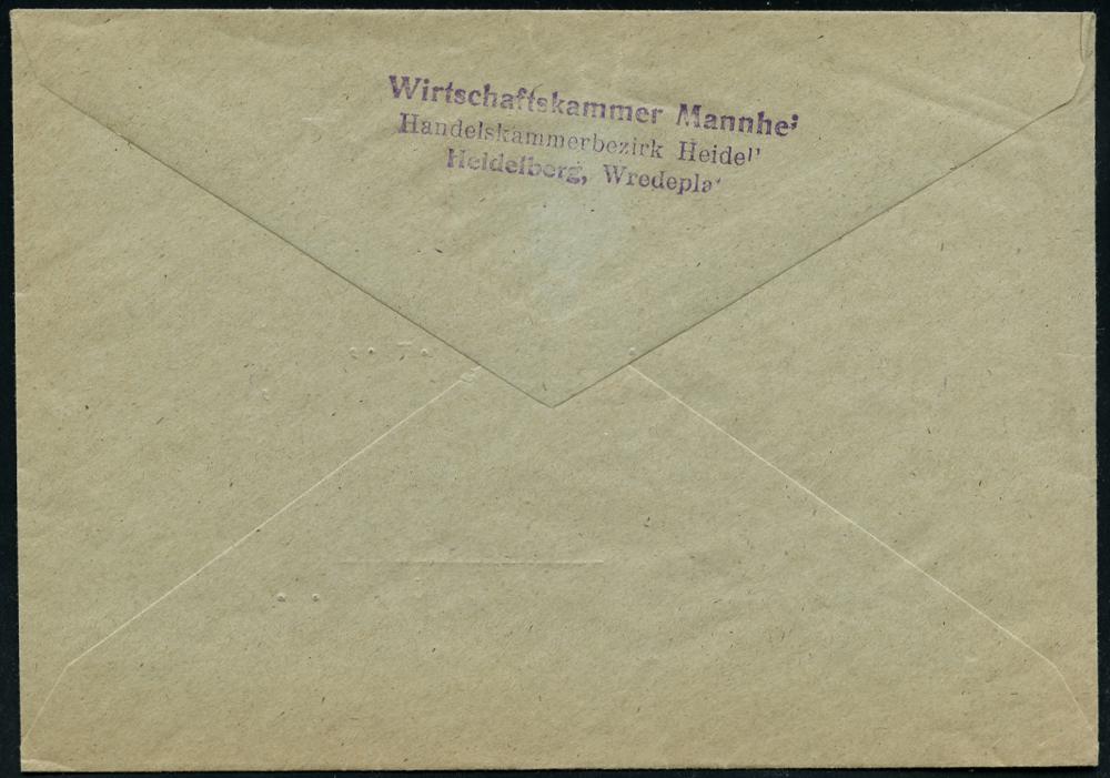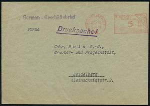 2982 | 16 € | 6900 Heidelberg Post-Freistempel : (17a) HEIDELBERG 1/ ag/ Deutsches/ Reich 1945 (12.12.) aptierter PFS 5 Pf. "Adlerkopf/Hakenkreuz" = Hakenkreuz entfernt = Notmaßnahme! , rs. Abs.-3L: Wirtschaftskammer Mannheim.., Orts-Drs.-Bf. "German - Geschäftsbrief" (Dü.D-8, Nr.225) | ![]() ![]() ![]() | |