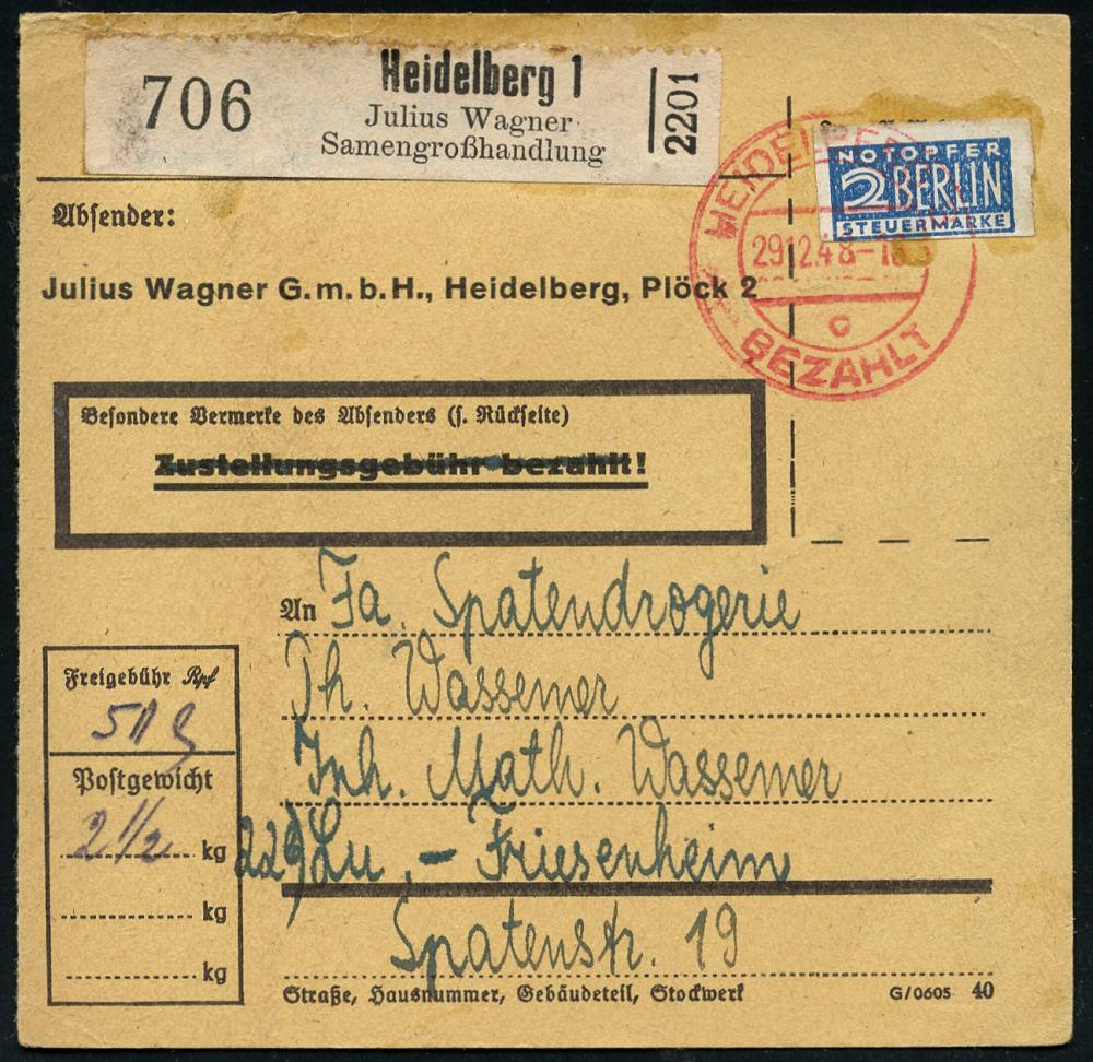 2986 | 15 € | 6900 Heidelberg Post-Freistempel : HEIDELBERG 3/ c/ BEZAHLT 1948 (29.2.) Hand-PFS 2K-Steg auf 2 Pf. NoB + schw. Selbstbucher-Paketzettel: Heidelberg 1/Julius Wagner/ Samengroßhandlung , Inl.-Selbstbucher-Paketkarte n. Lu.-Friesenheim (Dü.A-7, Nr.32) | ![]() | |