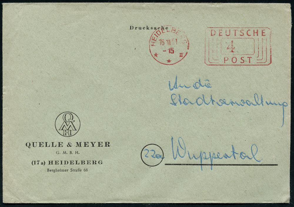 2992 | 6 € | 6900 Heidelberg Post-Freistempel : HEIDELBERG/ **III/ DEUTSCHE/ POST 1951 (16.10.) PFS "Linienrechteck" 4 Pf. auf Firmen-Bf.: QUELLE & MEYER GMBH.. (Logo) (Dü.D-10, Nr.253) | ![]() | |