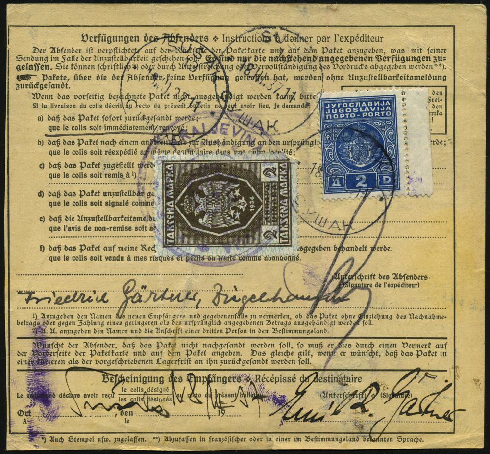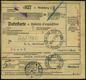 2975 | 18 € | 6900 Heidelberg Post-Freistempel : HEIDELBERG/ 1. 1937 (11.3.) viol. Anker-Registrierkassen-Paket-FS *2.25 RM + Weimarer Prägeadler horizontal (Paketkt. oben gering verkürzt) + schw. Paketzettel: a Heidelberg 1, Ausl.-Paketkt. n. Susak, div. TS/AS, rs. jugoslaw. Tax- u. Fiskalmarke (Dü.H-1A/2) | ![]() ![]() | |