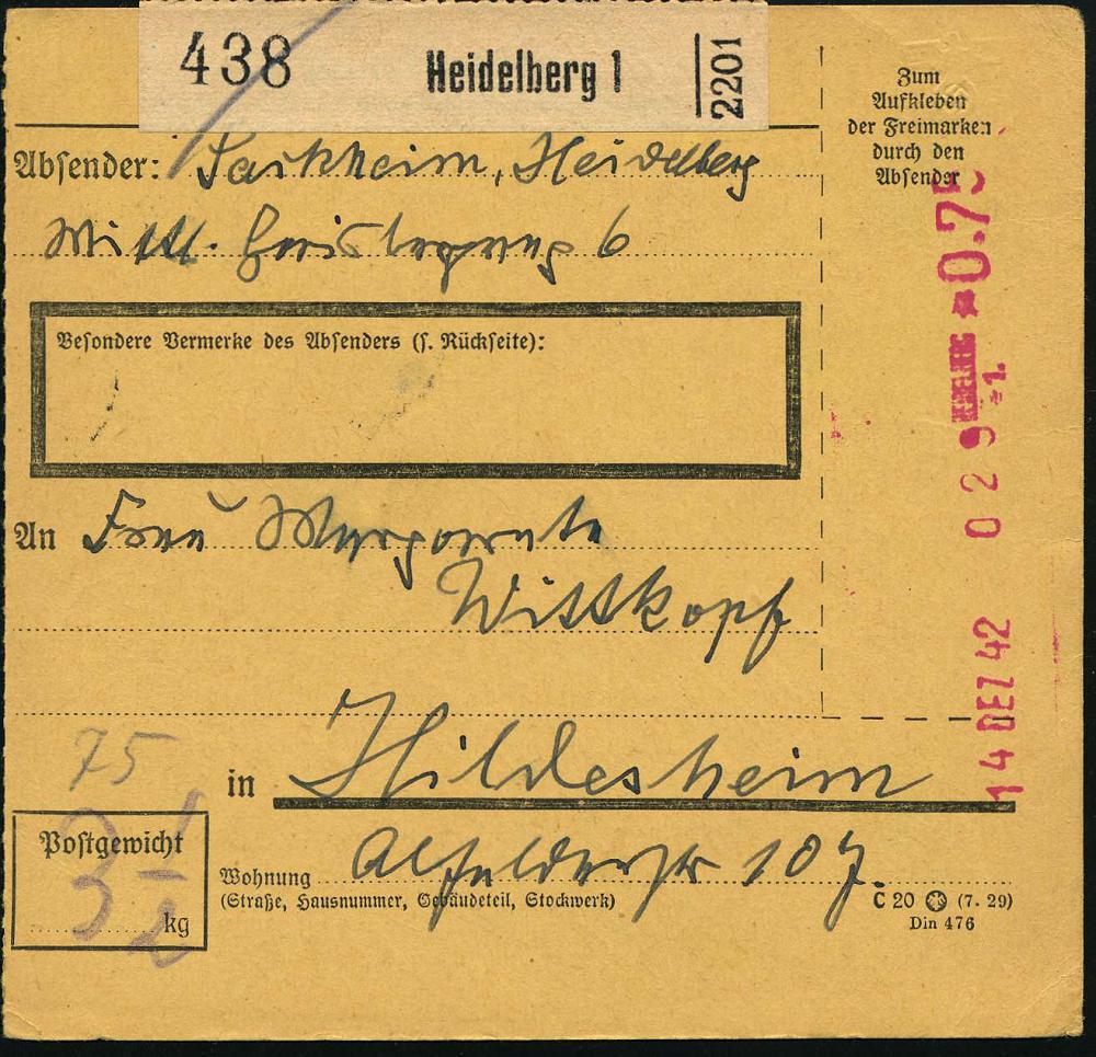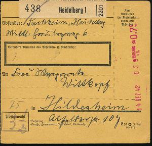 2980 | 18 € | 6900 Heidelberg Post-Freistempel : HEIDELBERG/ 1. 1942 (Dez.) Anker-Registrierkassen-Paket-FS *0.75 RM + NS-Prägeadler horizontal + schw. Paketzettel: Heidelberg 1, Inl.-Paketkt. n. Hildesheim (Dü.H-1A / 2) | ![]() | |