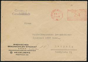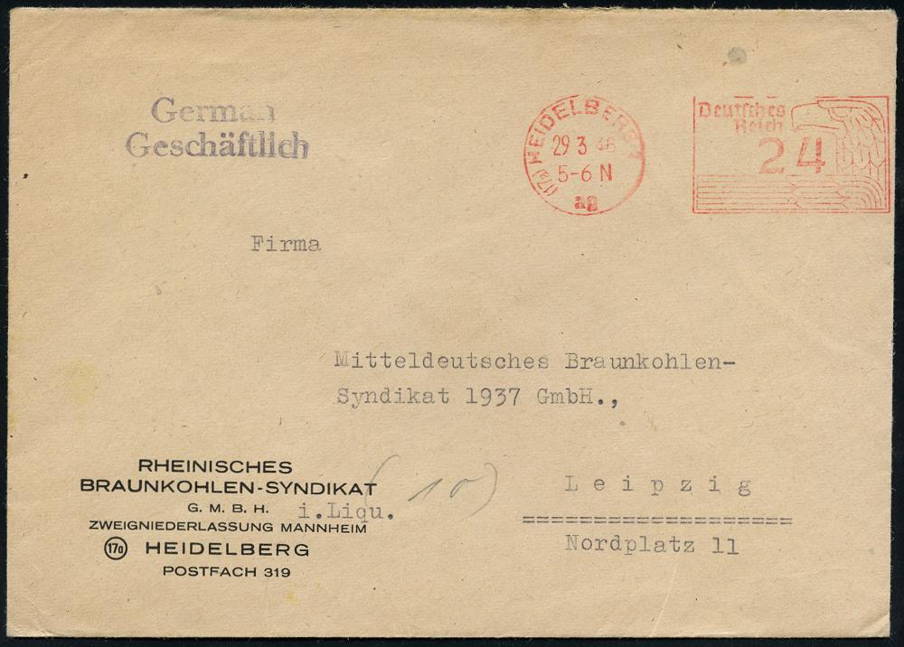 2984 | 20 € | 6900 Heidelberg Post-Freistempel : (17a) HEIDELBERG 1/ ag/ Deutsches/ Reich 1946 (29.3.) aptierter PFS "Adlerkopf/Hakenkreuz" = Hakenkreuz entfernt 24 Pf. = Notmaßnahme , Firmen-Bf.: RHEIN. BRAUNKOHLEN-SYNDIKAT GMBH mit Zusatz "i.(n) Liqu.(idation)" = Entflechtung durch Alliierte Kontrollkommission! an das Mitteldeutsche Braunkohlen-Syndikat n. Leipzig! = Zeitgeschichte! (Dü.D-8, Nr.225) | ![]() ![]() | |