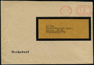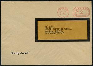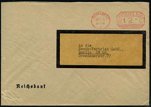 2977 | 15 € | 6900 Heidelberg Post-Freistempel : HEIDELBERG 1/ p/ DEUTSCHES REICH 1938 (28.2.) PFS "Achteck" 12 Pf. = Briefporto! , Reichsbank-Dienst-Bf. (Dü.D-4) | ![]() ![]() | |