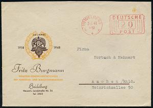 2987 | 15 € | 6900 Heidelberg Post-Freistempel : HEIDELBERG/ **III/ DEUTSCHE/ POST 1949 (3.6.) PFS "Linienrechteck" 20 Pf. auf zweifarbigem Jubiläums-Reklame-Bf.: Fritz Burgmann.. FAHRZEUG- U. MASCHINENINDUSTRIE (Logo) (Dü.D-10, Nr.253) | ![]() | |