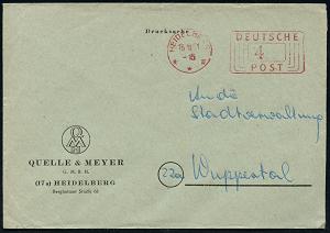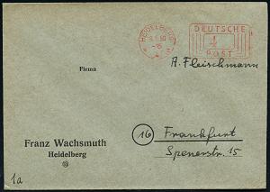 2990 | 6 € | 6900 Heidelberg Post-Freistempel : HEIDELBERG/ **III/ DEUTSCHE/ POST 1950 (9.5.) PFS "Linienrechteck" 4 Pf. auf Firmen-Bf.: Franz Wachsmuth.. (Dü.D-10, Nr.253) | ![]() | |