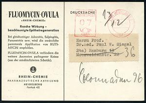 2993 | 20 € | 6900 Heidelberg Post-Freistempel : (17a) HEIDELBERG 3/ bd/ DEUTSCHE/ BUNDESPOST 1956 (12.12.) PFS "Posthorn" 07 Pf., Wertrahmen l i n k s , Color-Reklame-Kt.: RHEIN-CHEMIE:: FLUIMYCIN-OVULA:: Epithelregeneration (Dü.D-17) | ![]() ![]() | |