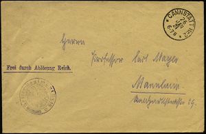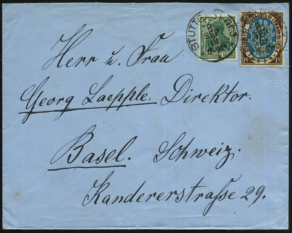 3133 | 20 € | 7000 Stuttgart Allgemeine Belege : STUTTGART Nr.3 1919 (8.9.) 1K auf 5 Pf.Germania u. 15 Pf. National-Versammlung (rs. Klappe fehlt) 15 Pf. Nat.-Versammlung ins Ausland unzulässig, unbeanstandeter Ausl.-Bf. n. Basel (Mi.8 5 II, 108) | ![]() | |