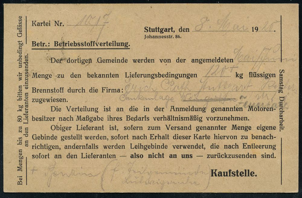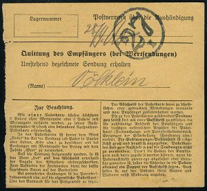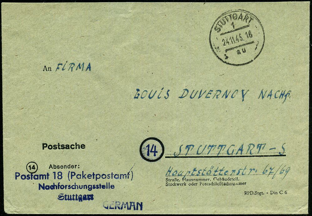 3150 | 14 € | 7000 Stuttgart Allgemeine Belege : STUTTGART/ 1/ au 1945 (24.11.) aptierter 1K-HWSt = "Stadt der Auslandsdeutschen" entfernt + viol. 3L: Postamt 18 (Paketpostamt)/ Nachforschungsstelle.., Ortsbf. (Bo.56 aptiert) | ![]() | |
