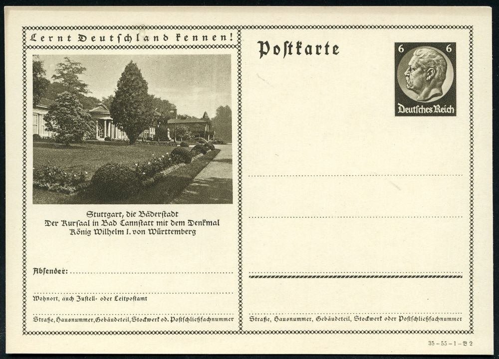 3145 | 10 € | 7000 Stuttgart Allgemeine Belege : Stuttgart 1935 6 Pf. BiP Hindenbg., braun: Denkmal König Wilhelm I. = 2. König v.Würrtembg. (1800 in österr. Heeresdienst, Agrarreformer, Pferdezüchter) ungebr. (Mi.P 236) | ![]() | |