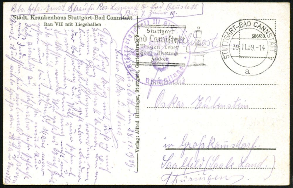 3147 | 15 € | 7000 Stuttgart Allgemeine Belege : Stuttgart.Bad Cannstatt 1939 (39.11.39) MaWSt.: STUTTGART-BAD CANNSTATT 1/a/..Magen-Leber/Herz-Rheuma (Brunnen) Stpl.-Irrtum (39.11.) s/w.-Feldpost-Foto-Ak.: Städt. Krankenhaus Bad Cannstatt Bau VII + viol. 1K-HdN: Reservelazarett III Stuttgart n. Großkaunsdorf | ![]() ![]() | |
