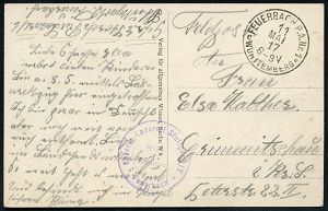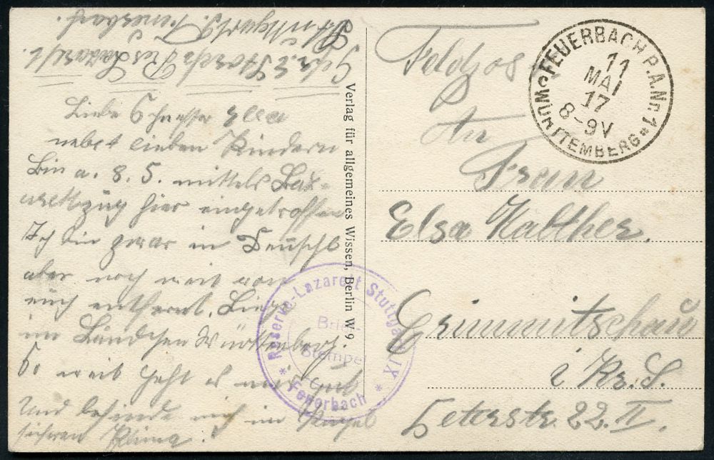 3132 | 14 € | 7000 Stuttgart Allgemeine Belege : Stuttgart-Feuerbach 1917 (11.5.) 1K: FEUERBACH P.A.Nr.1/c*/WÜRTTEMBERG + viol. HdN: Reserve-Lazarett Stuttgart IX/ Feuerbach, Fp.-Ak (Westfront) | ![]() ![]() | |