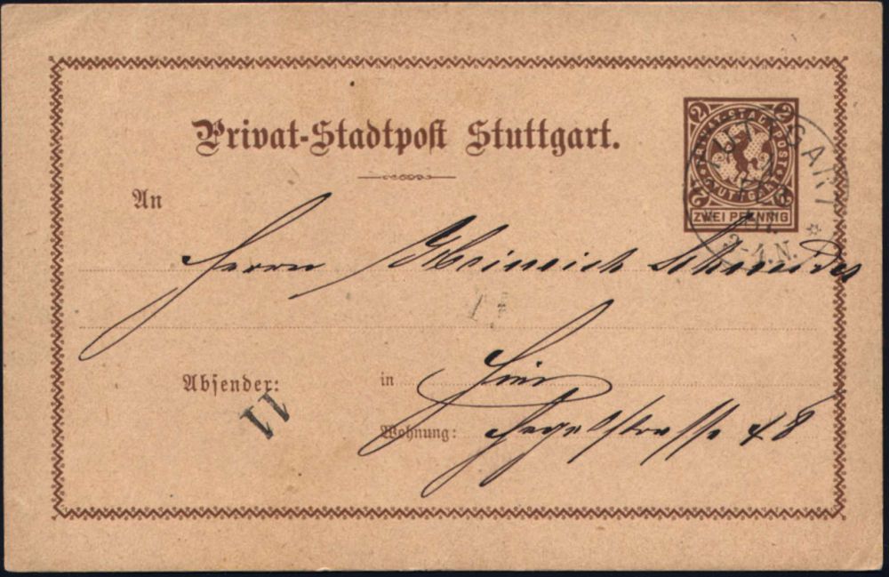 3123 | 20 € | 7000 Stuttgart Allgemeine Belege : Stuttgart 1887 (4.2.) Privat-Stadtpost, Orts-P. 2 Pf. Pferdwappen, braun, 1K:STUTTGART/** + PaginierSt "11", Bedarf! (ME.P 1) | ![]() | |