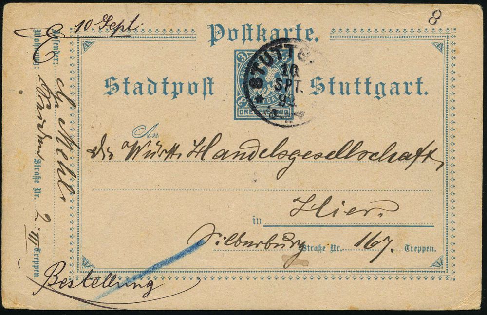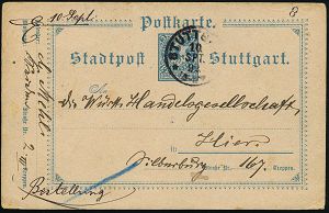 3124 | 23 € | 7000 Stuttgart Allgemeine Belege : Stuttgart 1892 (10.9.) "Stadtpost Stuttgart", Orts-P 3 Pf. "Pferdewappen", blau + 1K: STUTTGART + PaginierSt. "8", Bedarf | ![]() | |