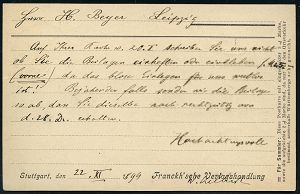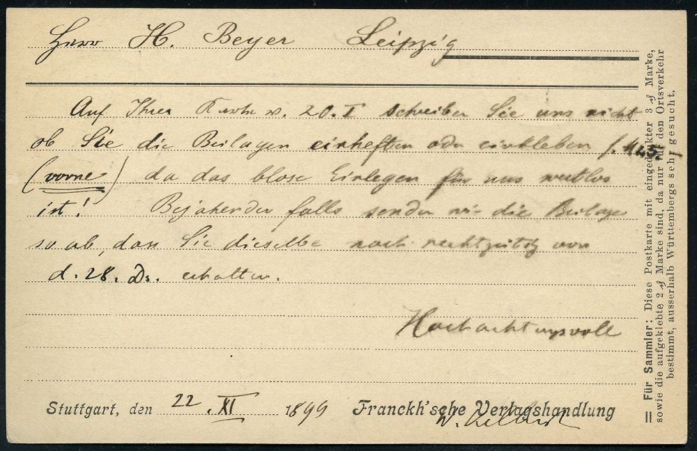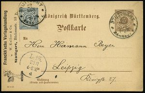 3126 | 35 € | 7000 Stuttgart Allgemeine Belege : Stuttgart 1899 (22.11.) Reklame-PP 3 Pf. Ziffer, braun: Franckh´sche Verlagsbuchhandlung, W.Keller & Co.. = Engel mit Fackel u. Lorbeerzweig + Zusatzfrank. 2 Pf. (STUTTGART/ BAHNHOF) seltene Fernkt. (Frech.PP 10/B 1../ nicht gelistet!) | ![]() ![]() | |
