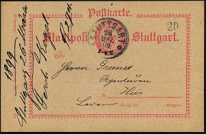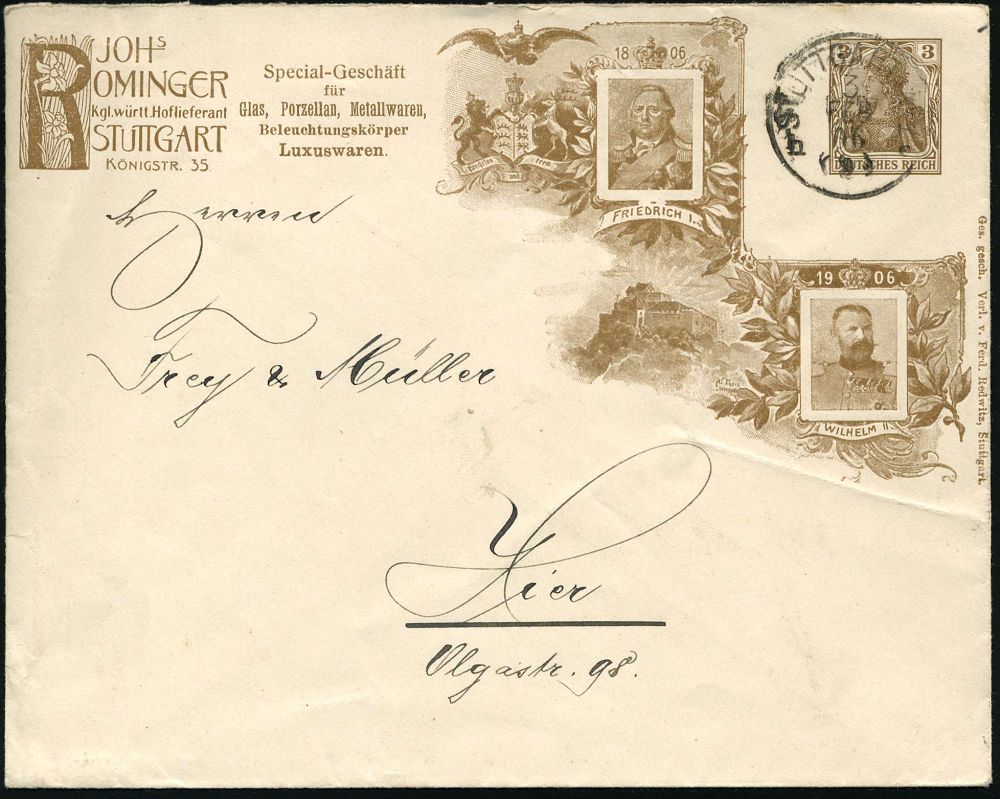 3127 | 30 € | 7000 Stuttgart Allgemeine Belege : STUTTGART 1906 1K auf Reklame-PU 3 Pf. Germania, braun: JOHs ROMINGER.. Glas, Porzellan, Metallwaren.. = Friedrich I., Wilhelm II, Osterglocken (Königs-Jubil.) etc. (leichte Beförd.-Spuren) seltener Bedafrs-Bf. (ME.PU 24/D 4) | ![]() | |