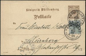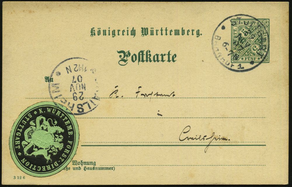 3128 | 18 € | 7000 Stuttgart Allgemeine Belege : STUTTGART/ BAHNHOF 1 1907 (29.11.) 1K auf Dienst-P 5 Pf. grün + grün-schwarze Siegel-Oblate: WÜRTTEMB. FORST-DIRECTION (Staatswappen) Dienst-Kt. n. Craislheim (AS) (Mi.DP 29) | ![]() | |