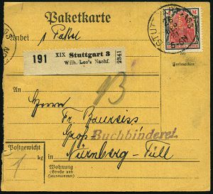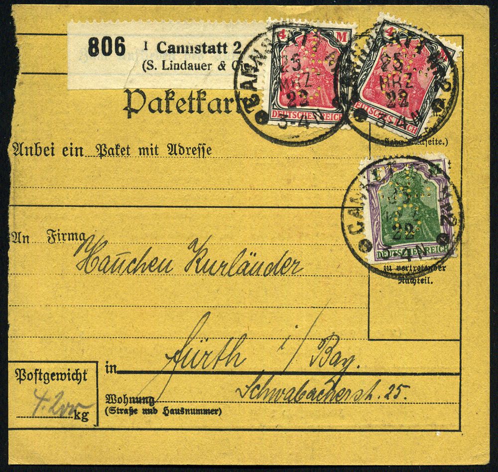 3137 | 20 € | 7000 Stuttgart Allgemeine Belege : Cannstatt 2 1922 (25.3.) 1K: CANNSTATT Nr.2 auf Germania 1 Mk. u. 2x 4 Mk., je mit Firmenlochung: "S L C" = S. L indauer & Cie. + entspr. Selbstbucher-Paketzettel: Cannstatt 2/(S. Lindauer & Cie.), Inl.-Selbstbucher-Paketkt. (Mi.150, 2x 153, Perfin) | ![]() | |