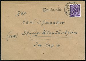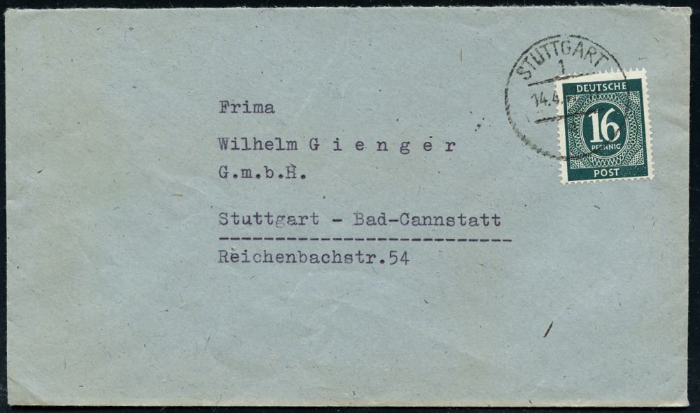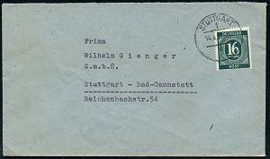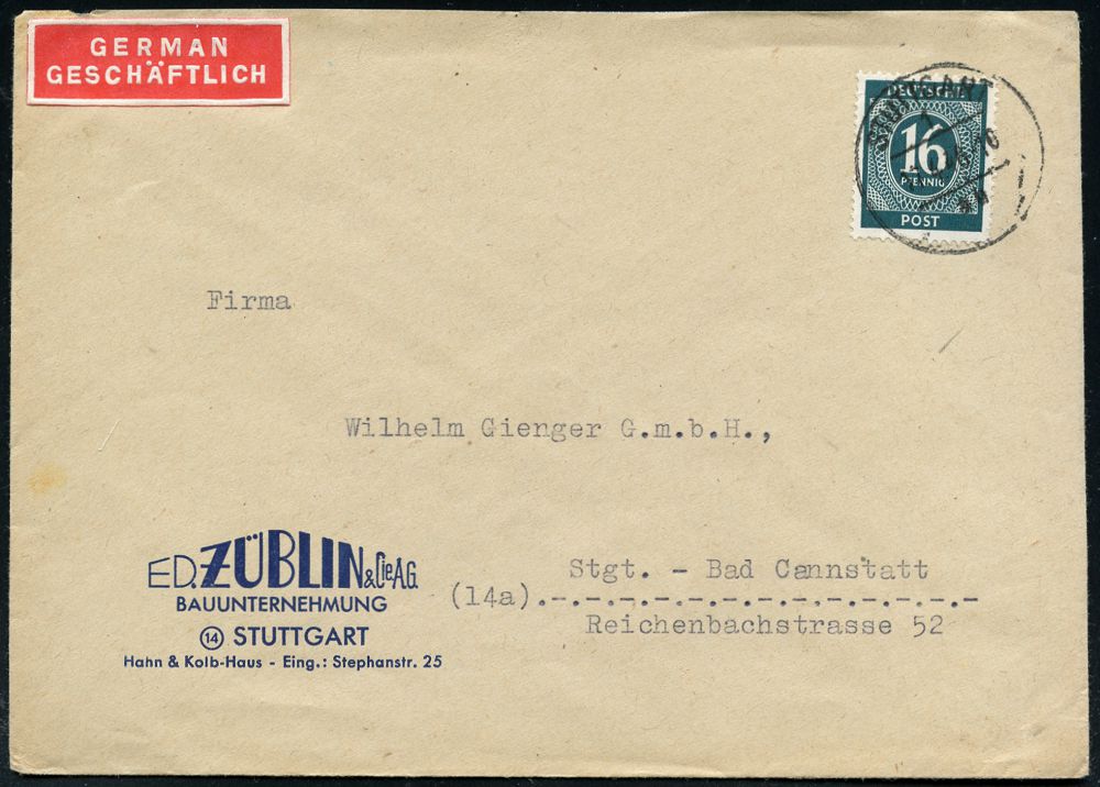3152 | 12 € | 7000 Stuttgart Allgemeine Belege : STUTTGART/ 1/ ah 1946 (17.4.) aptierter 1K-HWSt = "STADT DER AUSLANDSDEUTSCHEN" entfernt auf EF 16 Pf. Ziffer , rotes Label: GERMAN/ GESCHÄFTLICH, Firmen-Orts-Bf.: ED, ZÜBLIN.. BAUUNTERNEHMUNG (Bo.56 aptiert) | ![]() | |