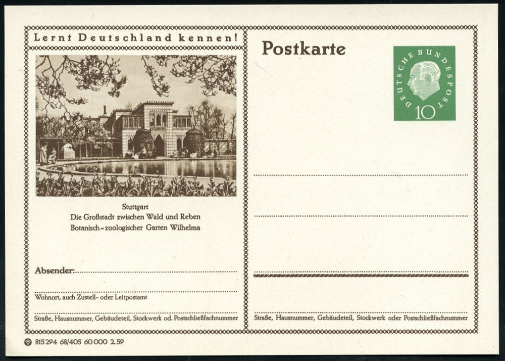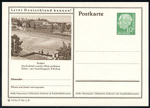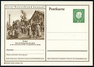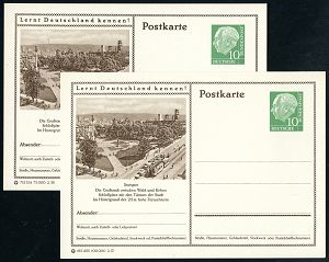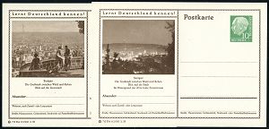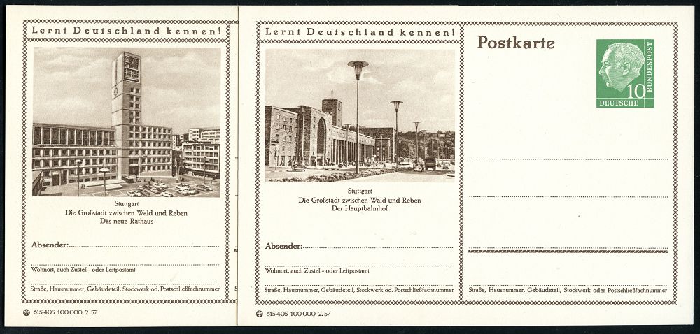 3159 | 20 € | 7000 Stuttgart Allgemeine Belege : Stuttgart 1957/58 10 Pf. BiP Heuss I, grün, 5 verschiedene Bilder: Hauptbahnhof, Neues Rathaus, Nachtblick auf die Stadt, Innenstadt u. Park Killesberg , (Einzelverkauf möglich: je 5.- EUR) alle ungebr., 5 Belege (Mi.P 24) | ![]() ![]() ![]() | |