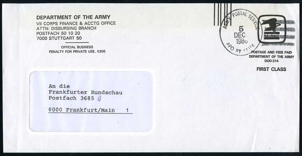 3163 | 10 € | 7000 Stuttgart Allgemeine Belege : 7000 Stuttgart 50 1986 (5.12.) US-Feldpoststpl. (Killer): ARMY POSTAL SERVICE/ APO NY (0915A) = VII CORPS FINANCE & ACCTG OFFICE (Stuttgart) portofreier Inl.-Dienst-Bf. | ![]() | |