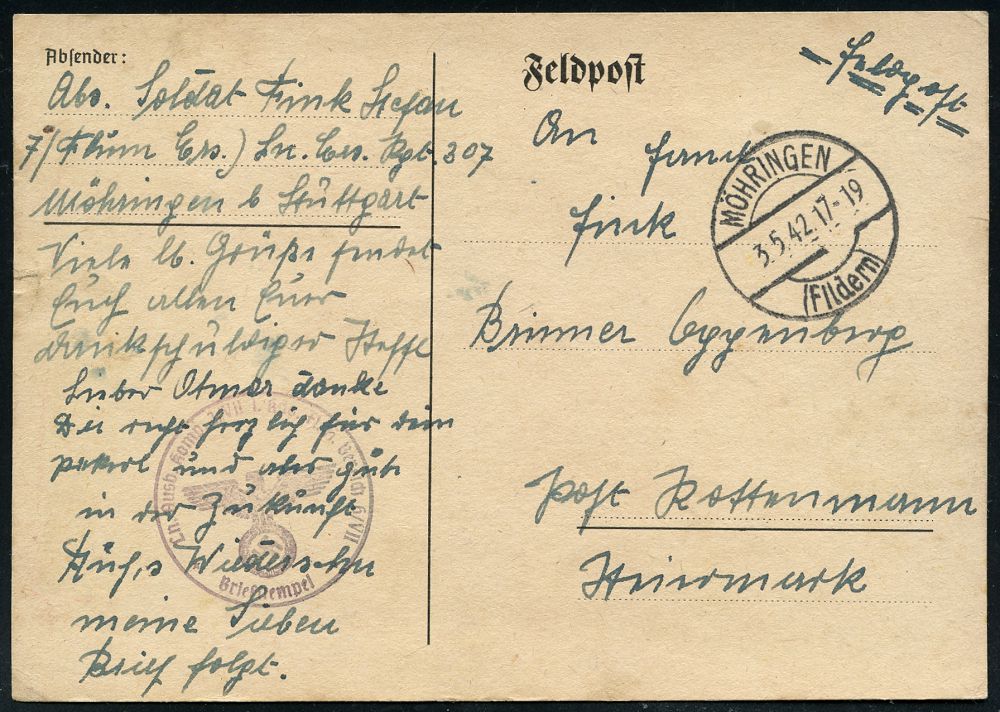 3164 | 16 € | 7000 Stuttgart Allgemeine Belege : MÖHRINGEN/ (Fildern) 1942 (3.5.) 1K-Brücke + viol. 1k-HdN + hs. Abs.: ".. Ln. (Luftwaffen) Ers. Rgt. 307, Möhringen.." (Flughafen-Bereich 6/VII), Feldpost-Kt. n. Rottenmann / Stmk. | ![]() | |