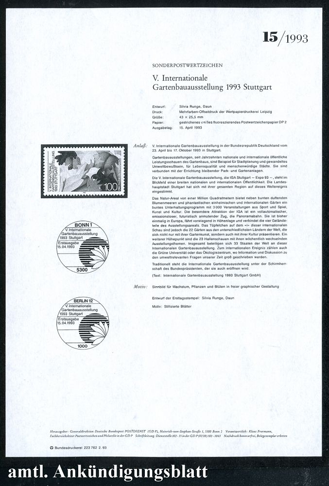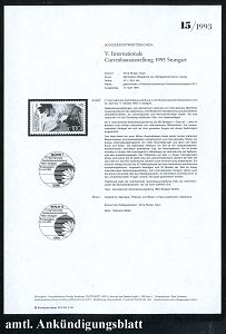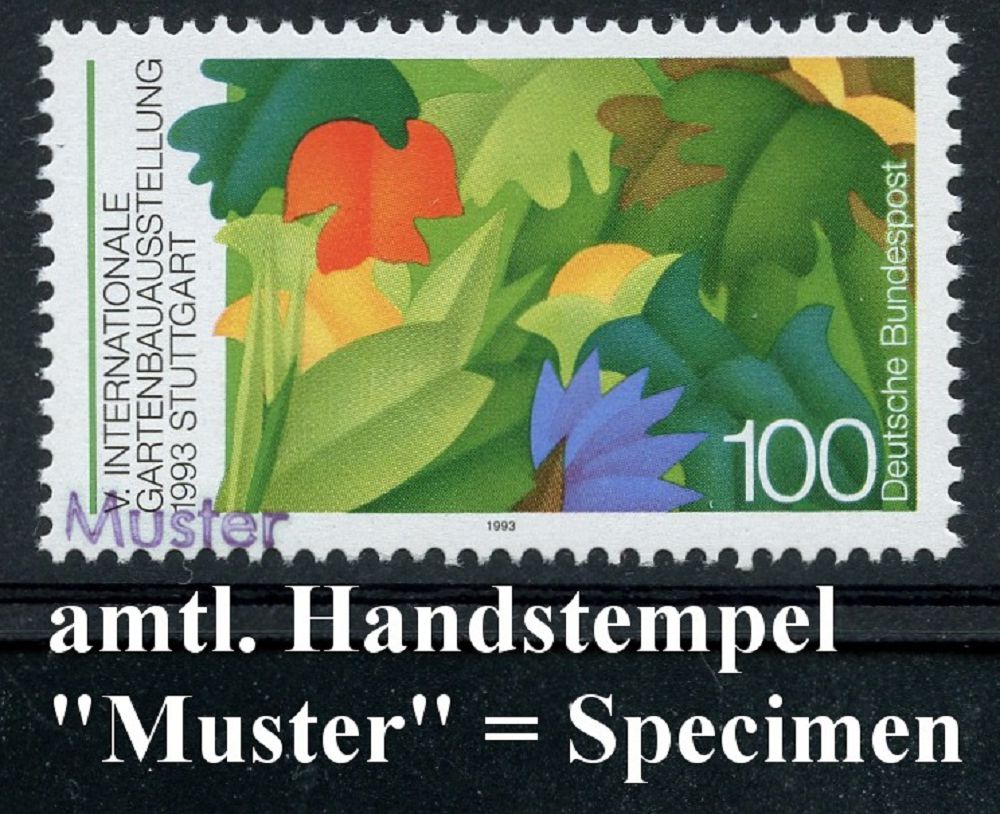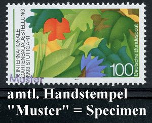 3166 | 30 € | 7000 Stuttgart Allgemeine Belege : B.R.D. 1993 (Apr.) 100 Pf. "V. Internat. Gartenbauausstellung 1993 Stuttgart" mit amtl. Handstempel: "M u s t e r" + amtl. Ankündigungsblatt derBundesdruckerei (Format A4) 2 Belege kompl.!, selten! (Mi.1672 Muster = Specimen) | ![]() ![]() ![]() | |
