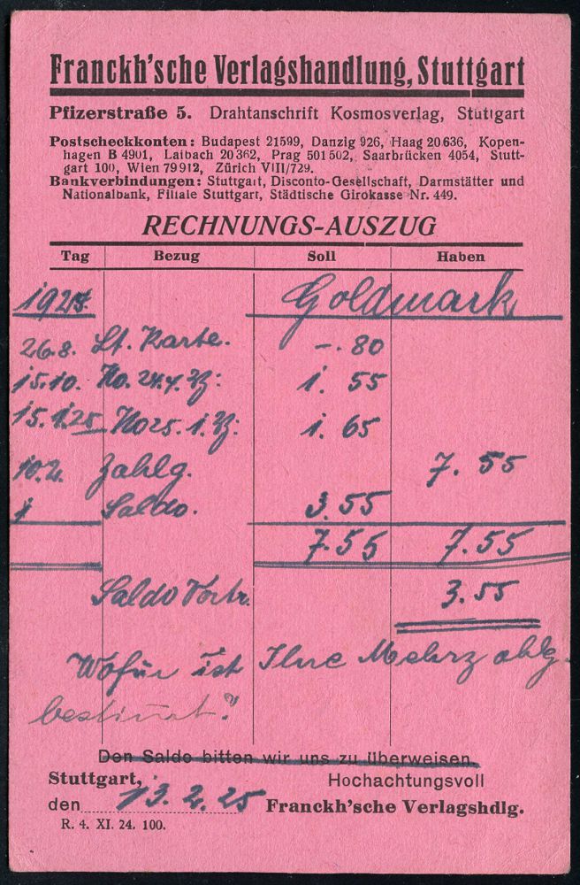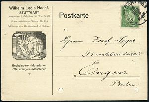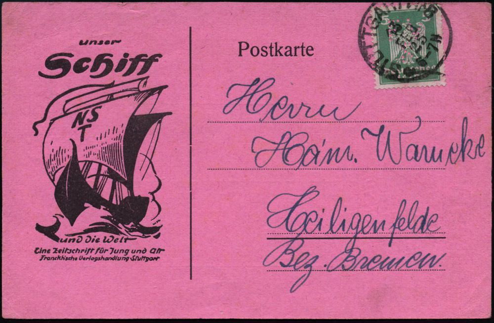 3139 | 18 € | 7000 Stuttgart Allgemeine Belege : STUTTGART Nr.8 1925 (13.2.) 1K auf EF 5 Pf. Adler m. Firmenlochung "F. V. / S." = F ranckh´sche Verlagsanstalt Stuttgart auf Reklame-Kt.: "Unser Schiff u.d.Welt" Eine Zeitschrift für Jung u.Alt.. (Segelschiff) Fernkt. m. Rechnungsauszug (Mi.357 , EF Perfin) | ![]() ![]() | |
